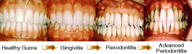 · Gingivitis: Esta primera etapa de la enfermedad es una inflamación de las encías provocada por la acumulación de placa en el borde de la misma, la cual, al no ser eliminada por el cepillado y el uso diario del hilo dental, produce toxinas que irritan el tejido gingival, causando gingivitis. Puede observarse sangrado durante el cepillado, al usar el hilo dental o incluso de manera espontánea. En esta primera etapa de la enfermedad, el daño puede revertirse, ya que el hueso y el tejido conectivo que sostiene los dientes en su lugar todavía no han sido afectados.